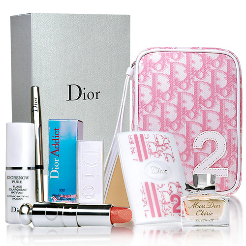 Dior自2001年開始,每年推出限量彩妝組數字包,是女孩心目中的夢幻逸品~ Dior今年選用的是台灣女性最愛的Dior Girly粉紅系列做為款式設計,此款限量數字包除了可作化妝包使用外,也可當作一般日常出門時的手拿包,一包兩用,相當超值。 1Dior雪晶靈超淨化美白限量粉餅#200 2Dior雪晶靈、超淨化透亮嫩白乳液10ml 3Dior迪奧癮誘珍燦唇膏限量色#332 4Dior迪奧時尚唇刷 5Miss Dior Cherie香水,4ml |