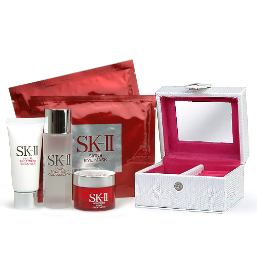 SKⅡ全效活膚眼膜2對,市價300 SKⅡ柔膚潔面乳20g,市價185 SKⅡ淨透潔顏油34ml,市價200 SKⅡ高效多元活膚霜15g,市價640 SKⅡ珠寶盒,9*5.5*7.5公分,內有鏡面、戒指夾層與首飾空間,市價680 |