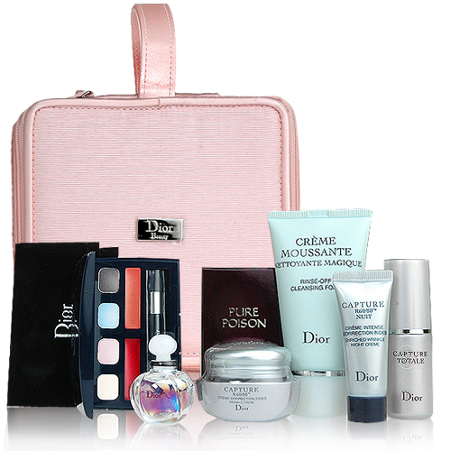 Dior彩妝盤:市價$980 元(內有4色眼影與2色唇密附刷) Dior水洗式泡沫潔面乳50ml:市價$300元 Dior全效無痕精華10ml:市價$1116元 Dior新逆時活膚乳霜15ml:市價$780元 Dior新逆時活膚晚霜10ml:市價$540元 Dior純真誘惑香水5ml:市價$210元 Dior-06緞面粉紅經典手提包:市價$580元 (長15cmX寬15cmX厚11cm,雙層拉鍊) |