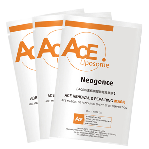 Neogence霓淨思ACE 新生修護超導纖維面膜,選用智慧煥膚因子Rovisome® ACE Plus、高濃度維他命A(Retinol)及胜肽撫紋因子MatrixylTM 3000、精純玻尿酸等有效配方,提出『全方位修護對策』,以特殊微乳化技術製成高濃縮精華乳液,搭配特殊剪裁、完全服貼臉部的『超導纖維棉』,讓高濃度微乳精華以『封閉式集中滲透法』完全釋放並被肌膚吸收。在短短15-20分鐘內,幫助肌膚高效補水、保水,為肌膚注入能量維他命ACE、輕柔潤澤,肌膚內外全面深度煥膚潤澤,達到『煥膚×抗老×亮白』三大功效!