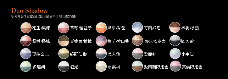 馬卡龍糖果雙色眼影 批號:06 (顏色:花生/焦糖) 批號:07 (顏色:草莓/覆盆子) 批號:08 (顏色:鳳梨/香橙) 批號:09 (顏色:可爾必思) 批號:10 (顏色:核桃/拿鐵) 批號:11 (顏色:桑椹/櫻桃) 批號:12 (顏色:百香果/橄欖) 批號:13 (顏色:梅子/紫山藥) 批號:14 (顏色:咖啡/巧克力) 批號:15 (顏色:歐芮歐) 批號:18 (顏色:愛爾蘭限定色) 批號:19 (顏色:英倫限定色) 批號:20 (顏色:莎拉公主) 批號:21 (顏色:綠野仙蹤) 批號:22 (顏色:美人魚) 批號:23 (顏色:愛麗絲) 批號:24 (顏色:小宇宙) 批號:25 (顏色:多瑙河) 批號:26 (顏色:極光) 批號:29 (顏色:冰淇淋) |