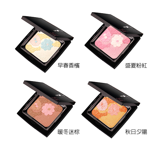 飽和的鮮豔色澤、透亮的細緻珠光,高光澤感粉末,混合刷取依然能呈現乾淨的透亮感,精緻奢華的花朵造型綻放於簡約時尚方盒中,附帶高質感的柔軟刷具,輕刷於臉龐,隨即閃耀如精靈般的金燦光芒。質地細緻服貼不飄粉,四種不同色調,可用於腮紅、修容外,也可當眼影使用,變換不同風情,可愛、奢華,盡現時尚風采。