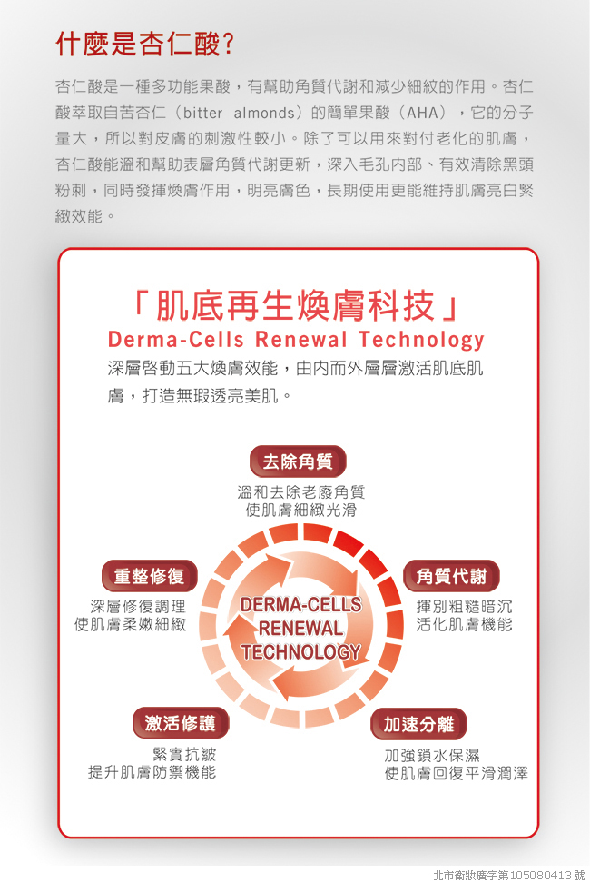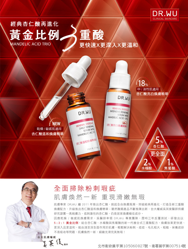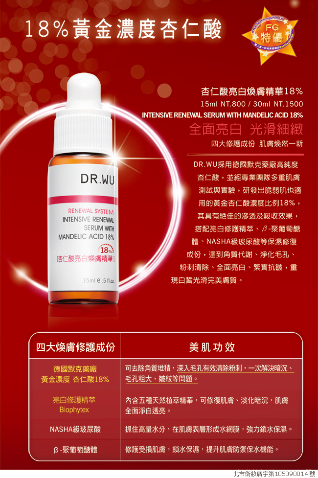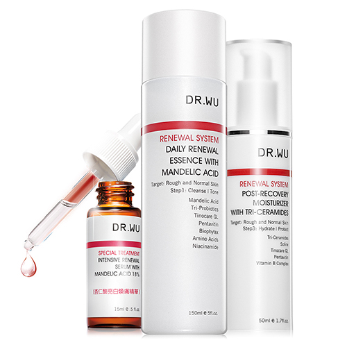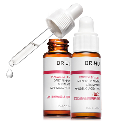 DR.WU採用德國默克藥廠高純度杏仁酸,並經專業團隊經多次多重肌膚測試與實驗,研發出脆弱肌也適用的黃金杏仁酸濃度比例18%,其具有絕佳的滲透及吸收效果,搭配亮白修護精萃、β-聚葡萄醣體、NASHA級玻尿酸等保濕修復及修護成份,達到角質代謝、淨化毛孔、粉刺清除、全面亮白、緊實抗皺,重現白皙光滑完美膚質。