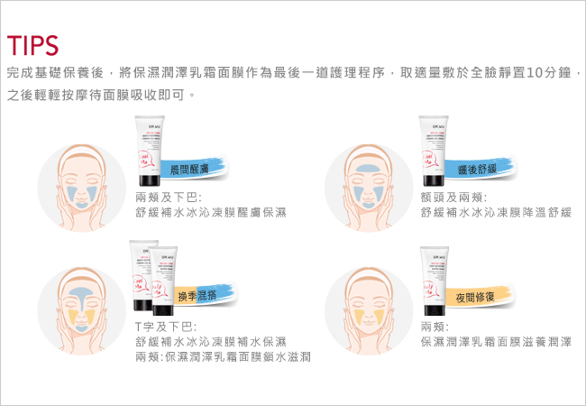 使用步驟:卸妝、清潔→化妝水→精華液→乳液、面霜→保濕潤澤乳霜面膜