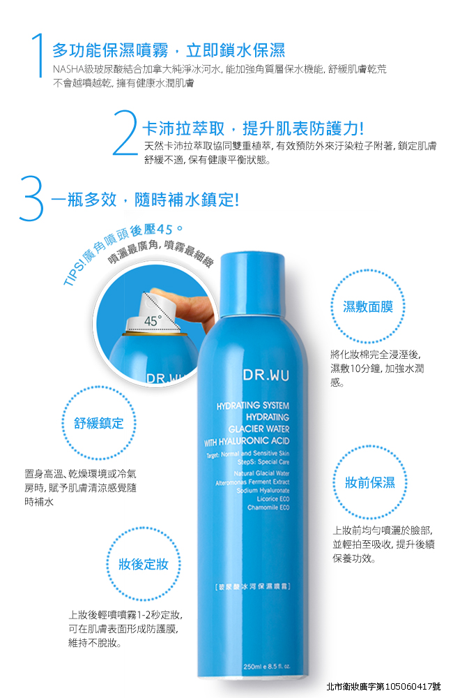 卸妝、清潔→玻尿酸冰河保濕噴霧→玻尿酸保濕化妝水→精華液→乳液、面霜→防曬隔離