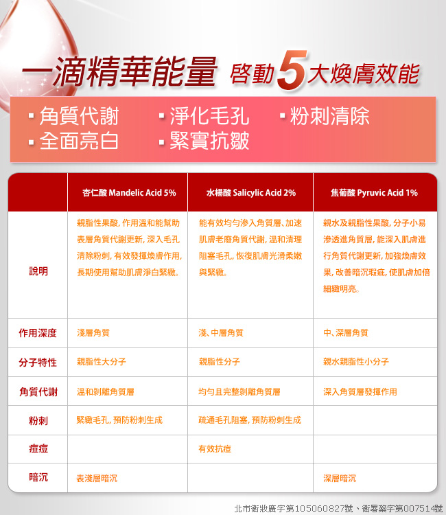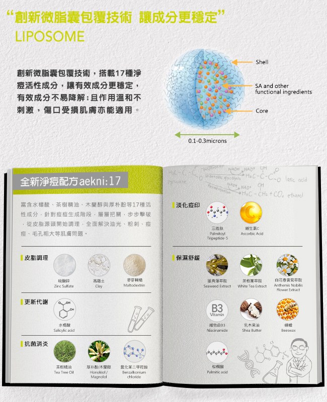 主要成分:全新淨痘配方aekni:17+杏仁酸Mandelic Acid+乳酸鋅Puramex Zn+金縷梅萃取Witch Hazel Extract+維他命B3 Niacinamide+維他命B5 Panthenol