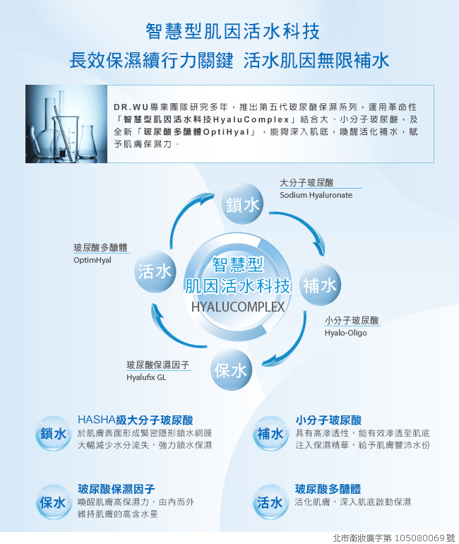 主要成份:HyaluComplex、甜杏仁Dulcemin、角鯊烷Squalane、高山黃芩萃取、接骨木精萃