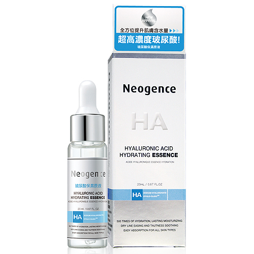 Neogence霓淨思玻尿酸保濕原液,能解決各種膚質含水量低、乾燥問題。精選非動物萃取的雙分子玻尿酸,調製為高濃度玻尿酸原液。短鏈玻尿酸HYALO-OLIGOTM,可快速抓住水分子,將水分帶入肌膚底層,幫肌膚補充大量水分;大分子玻尿酸能抓住大量水分,在肌膚表面形成涵水薄膜,持續釋放大量水分,幫助肌膚維持長效高含水量狀態。玻尿酸原液單獨使用,或與其他保養品調合後使用,皆可有效深層潤澤肌膚,改善肌膚乾燥粗糙狀況,紓緩因缺水所形成的乾燥細紋,增進肌膚的彈性、柔軟度與細緻度。清爽不含油的凝露質地,1-2滴全臉推開後快速滲透吸收;溫和無刺激性,適合各種膚質及美容課程後等細嫩肌膚使用。
