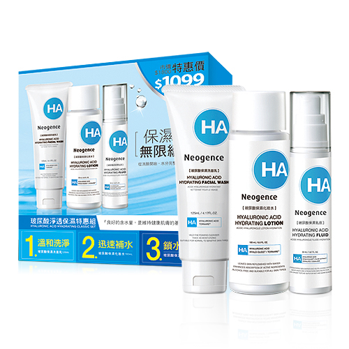 整組內含:玻尿酸保濕洗面乳125ml+玻尿酸保濕化妝水180ml+玻尿酸保濕乳液50ml