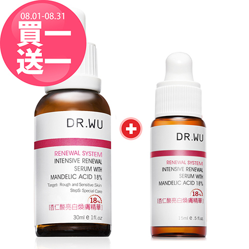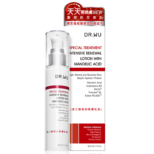 DR.WU採用德國默克藥廠高純度杏仁酸,並經專業團隊經多次多重肌膚測試與實驗,研發出脆弱肌也適用的黃金杏仁酸濃度比例18%,其具有絕佳的滲透及吸收效果,搭配亮白修護精萃、β-聚葡萄醣體、NASHA級玻尿酸等保濕修復及修護成份,達到角質代謝、淨化毛孔、粉刺清除、全面亮白、緊實抗皺,重現白皙光滑完美膚質。