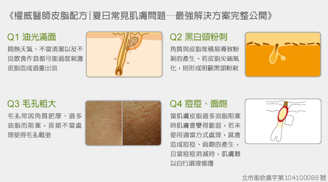 使用步驟:卸妝、清潔→淨痘粉刺調理化妝水→精華液→乳液、面霜→防曬隔離