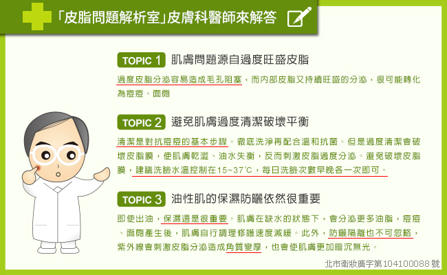 新油脂調理配方【控油力+保濕力+清爽度】升級,添加多重控油成分,能有效從油脂根源抑制油脂量並平衡T字帶過度油光問題;能溫和幫助肌膚角質代謝,有效疏通阻塞毛孔,預防及減少粉刺的形成;獨特無油清爽質地,持續使用肌膚平滑細緻、勻淨透亮,調理成不易泛油光的無瑕肌。