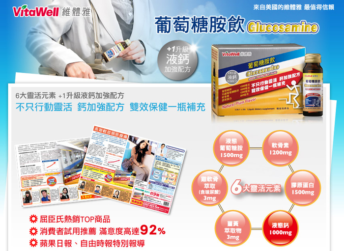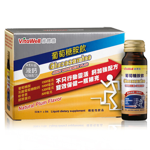 vatawell維體雅葡萄糖胺飲結合葡萄膅胺鹽酸鹽、軟骨素、膠原蛋白、葡萄糖酸鈣、雞軟骨萃取(含玻尿酸)、薑黃萃取物等六種靈活複方,是維持生理機能的最佳飲品。