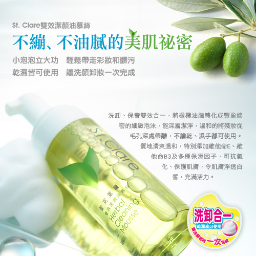「St. Clare雙效潔顏油慕絲」主要成分是採用來自義大利的植物橄欖油脂,卸妝更溫和;添加維他命E、維他命B3等,具備滋養、保濕與預防老化的成分,讓溫和卸妝、潔膚與滋潤保濕的舒暢體驗同步並存,不論妳是哪一種膚質,都可使用。