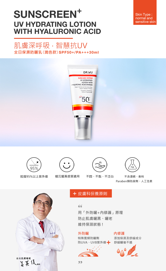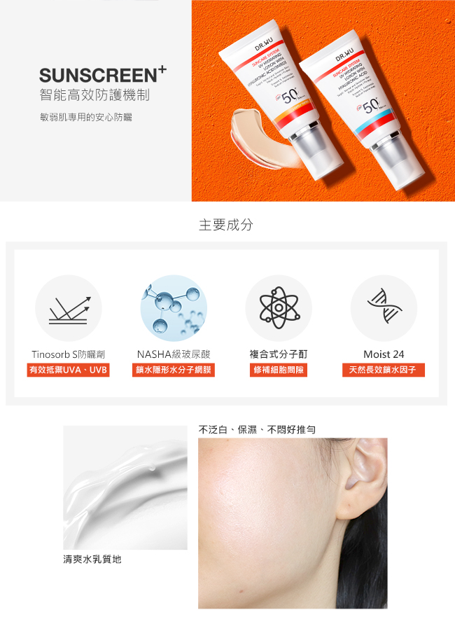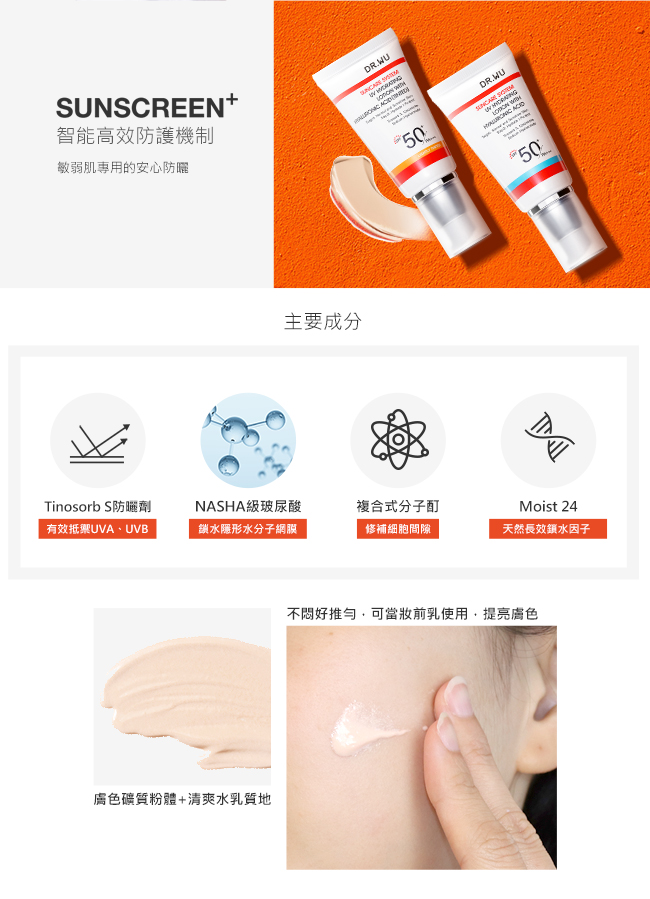 Tinosorb S 、NASHA級玻尿酸、複合式分子酊、天然長效鎖水因子 Moist 24